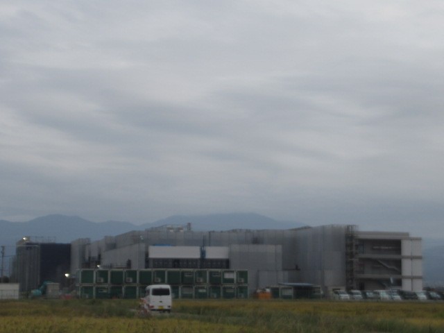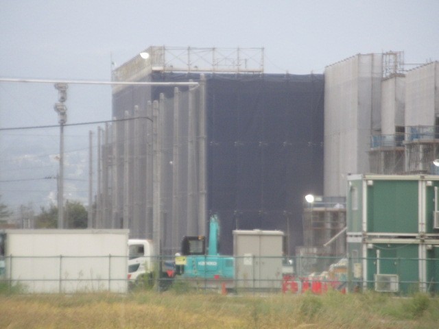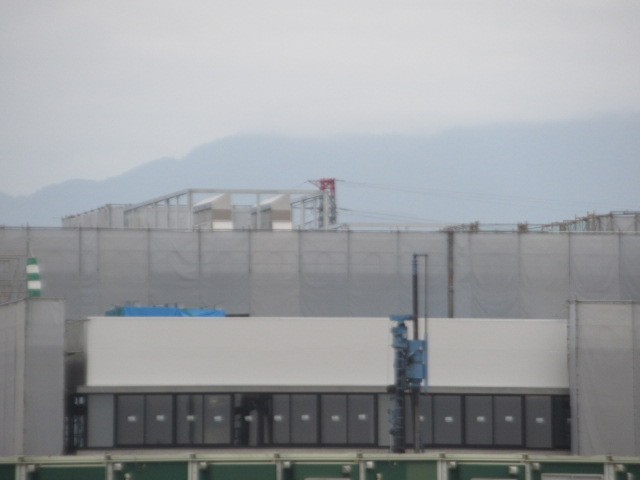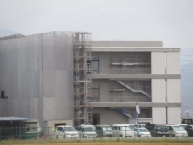 校舎西側の様子です。校舎のバックに薄っすらと見えるのは「立山連峰」です。工事用カバーが外され、少しずつ姿があらわれています・・・