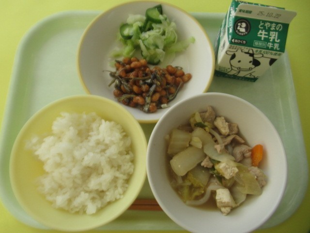 「白菜鍋」の中に「焼き豆腐」が入っています。今日、3年生は「豆腐づくり」(実感体験学習)をしました。家庭科室で、実際に「大豆→豆乳→豆腐」を楽しみながら、苦労して? 作り、試食してみました。「おいしぃ~!」 ものづくりの楽しさ、工夫、苦労・・・いろいろ感じとったのではないでしょうか? この後、国語科では「すがたをかえる大豆」という学習をします。五感・体全体をフルに働かせて学びを進めています・・・