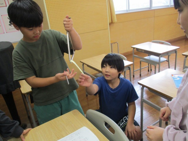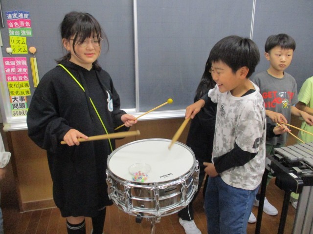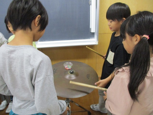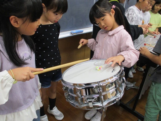 3年生は、理科「音の性質」の学習に取り組んでいます。今日は、音楽室で、トライアングルやシンバル、木琴、小太鼓などの楽器を使って、音の振動を確かめていました。大きい音や小さい音を出して、振動の違いを確かめていました。