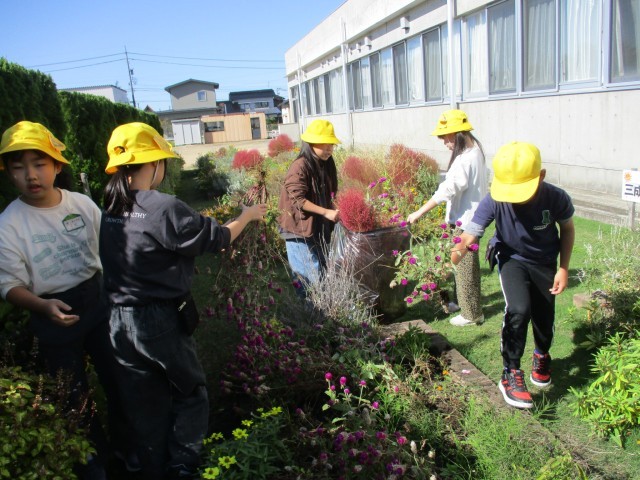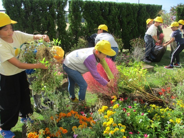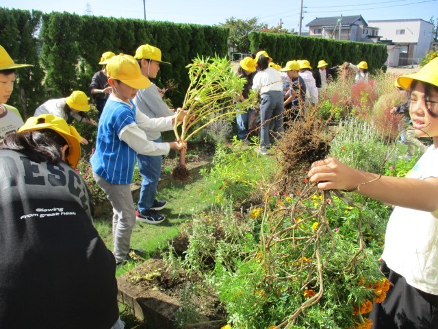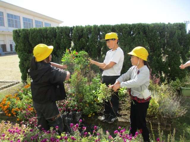 3年生は、グループに分かれ、協力して「三成っこ花壇」の片付けをしました。根に付いた土をしっかり落として、丁寧に作業を行いました。