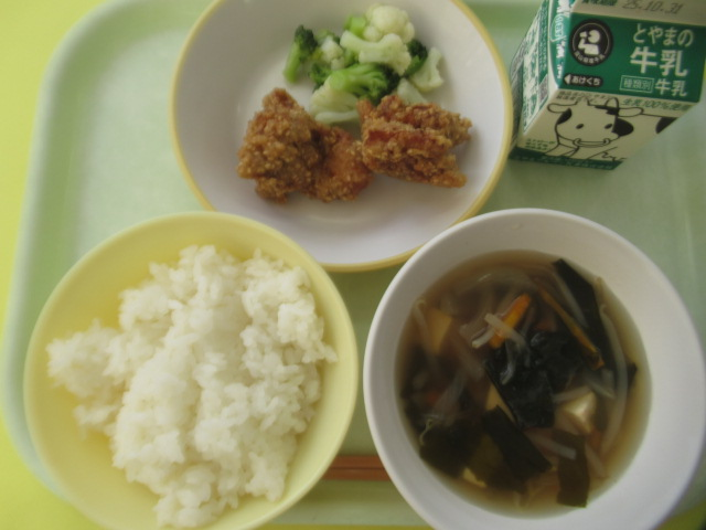 24日(金)今日の献立 公開日 2025/10/24 更新日 2025/10/24 給食室 ・ごはん ・牛乳 ・鶏肉のごま揚げ・花野菜サラダ ・わかめスープ※11時50分、検食終了。 今日のメニューは、子供たちの大好きな「鶏肉のごま揚げ」です。1・2年生は「1個」ずつです。