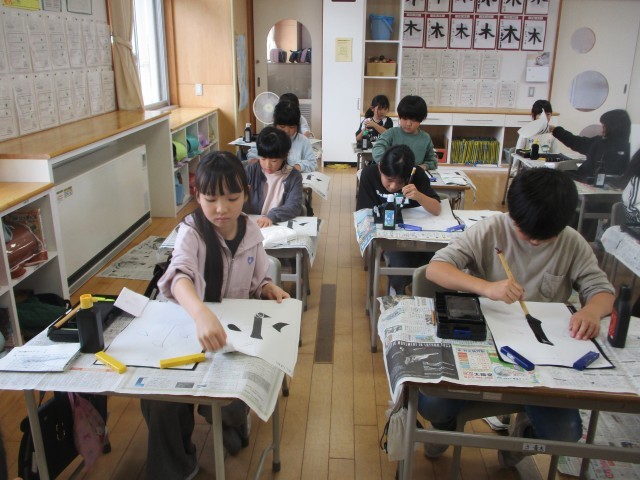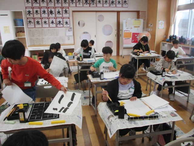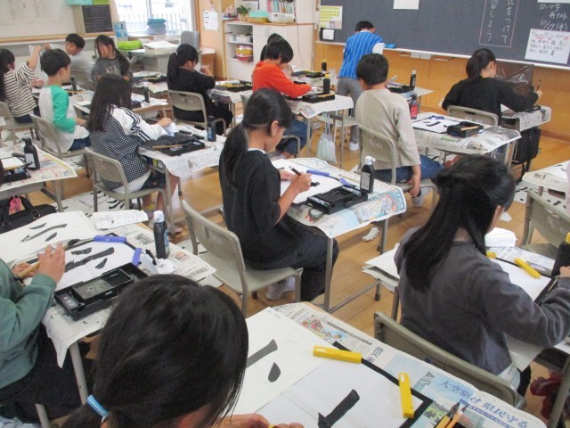 3年生は、書写の学習で「小」を書いています。バランスやはねに気を付けて集中して取り組んでいます。