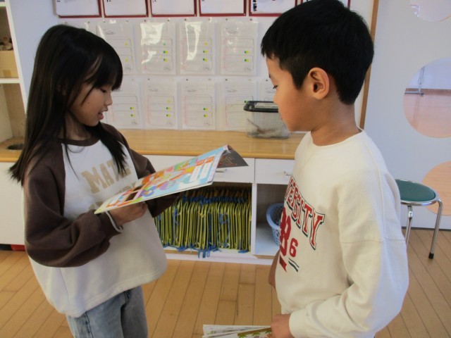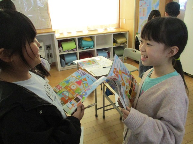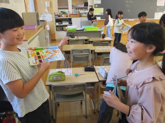 3年生は、外国語で形と色の言い方を学習しています。今日は、カードを使ってみんなでゲームをしました。1枚のカードを持ちながら、友達に質問し、友達のカードと自分のカードが同じだったらポイントがもらえるゲームでした。みんなは、友達に進んで英語で質問したり、答えたりしてゲームを楽しみました。