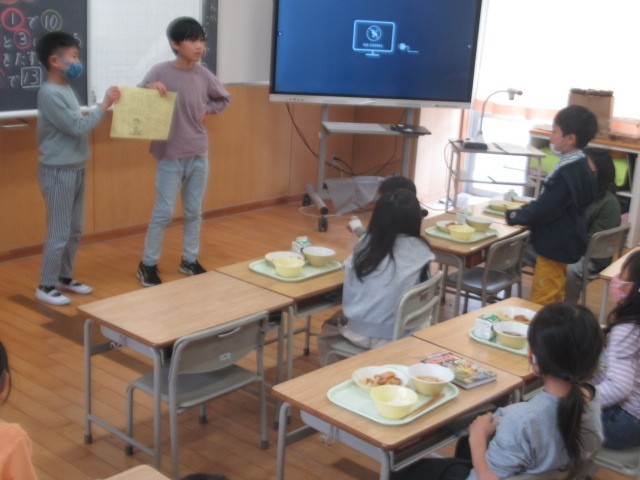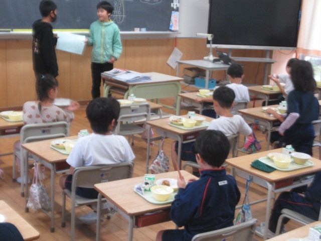 給食委員会が企画したイベント(なかよし会食、まめつかみ大会)の連絡を、給食委員が手分けして各教室へ出向き・・・