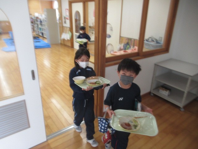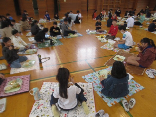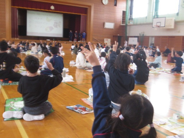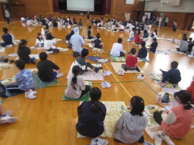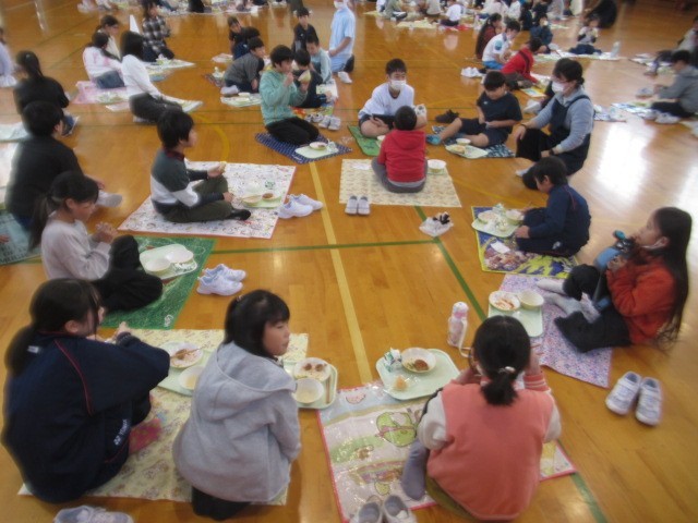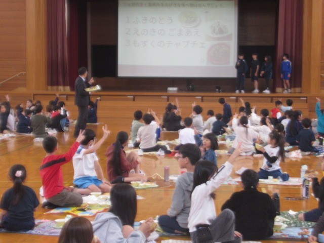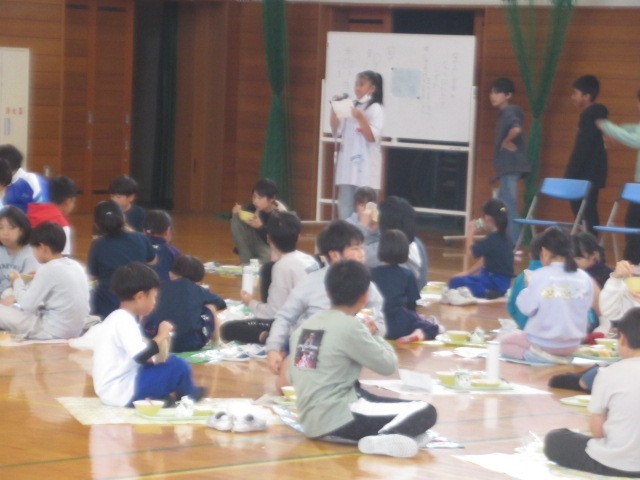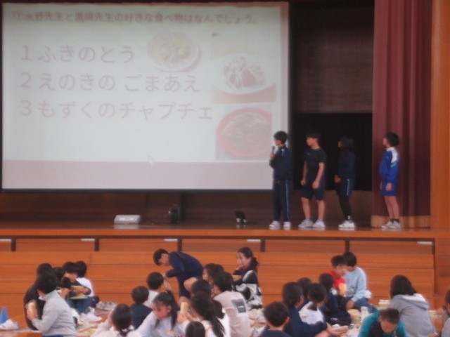 給食委員会が企画してくれた「もっと仲を深めよう会食」が実施されました。いつも校内放送で聞いている給食委員の「お昼の校内放送」を生(なま)で見たり、給食委員会のクイズに答えたり・・・楽しい給食時間になりました。