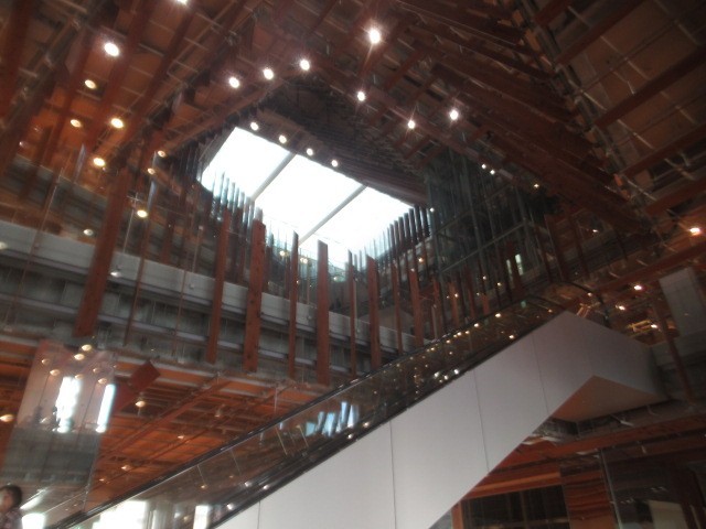 この複合施設「TOYAMAきらり」(2015年8月~)は、東京の「新・国立競技場」も設計した、世界的建築家・隈 研吾(くま けんんご)氏による設計です。エスカレーターで昇っていくのは・・・「立山登山」をイメージしているそうです。使われている富山県産木材をつなぎ合わせると、約何km になるでしょう?・・・約10km だそうです!