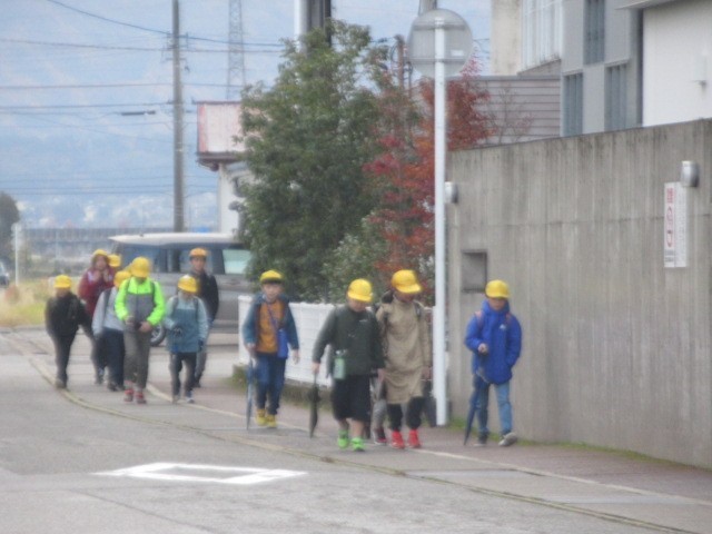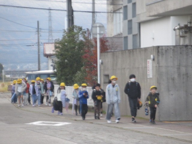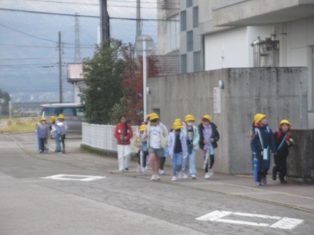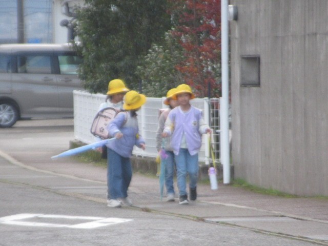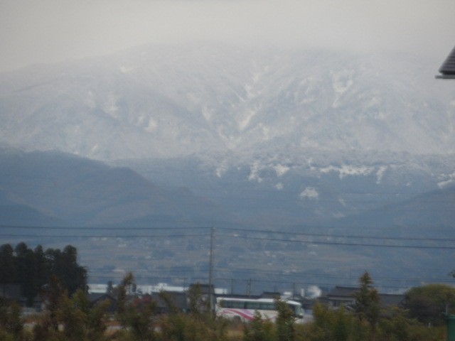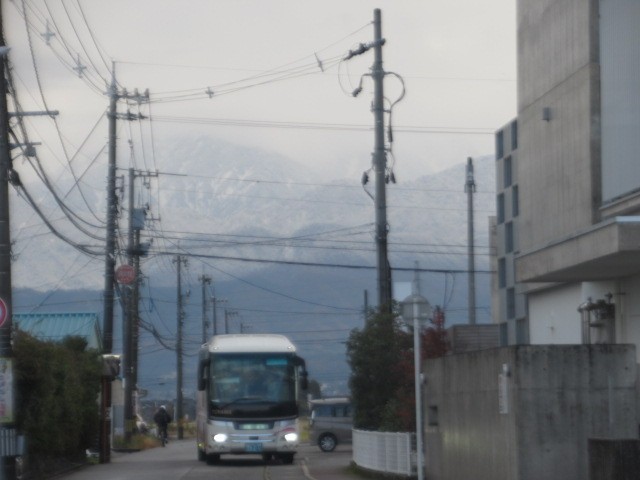 雪山をバックにスクールバスが到着しました。今朝も定刻より数分遅れての到着です・・・