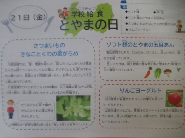今日は「学校給食とやまの日」です。富山県内・富山市内で育てられた食材がふんだんに使われています!