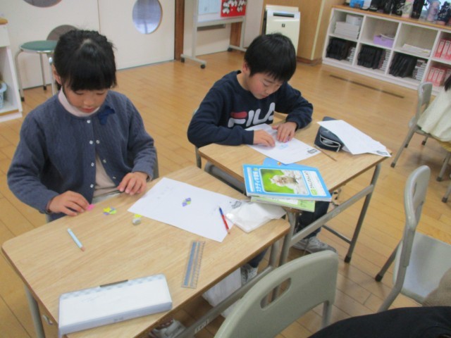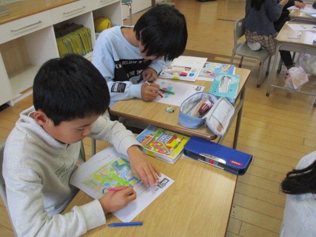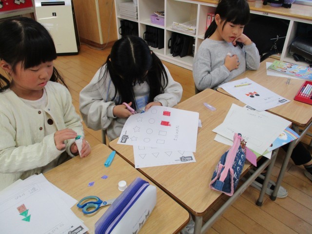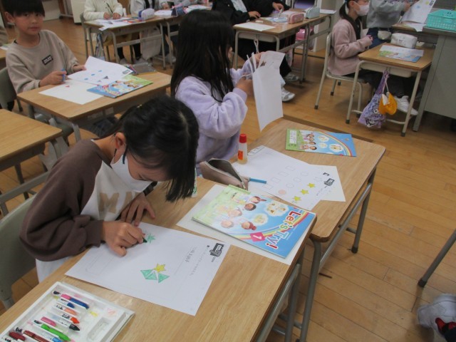 3年生は、先週に引き続き、外国語で形の言い方を学習しました。その形をかたどった紙を使って、友達に素敵なクリスマスカードを作りました。