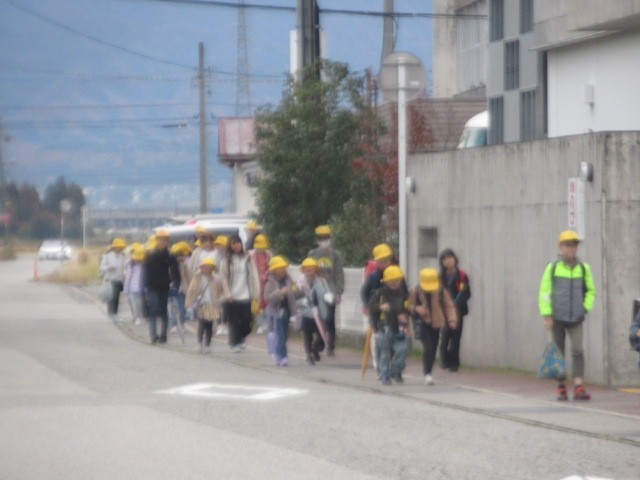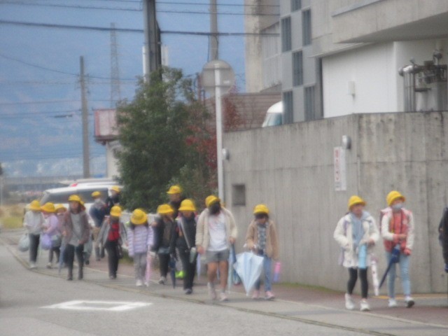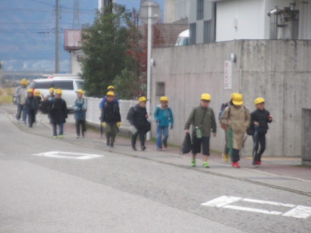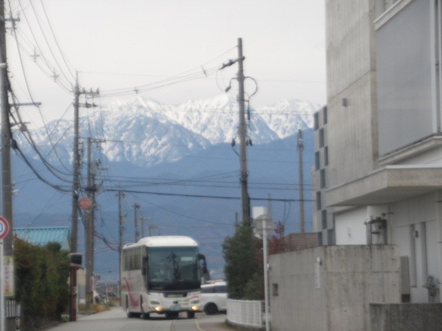 より白くなった雪山を背に、定刻(7時55分)に到着しました。元気に登校しています・・・
