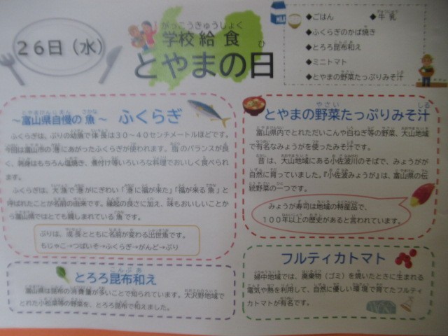 今日は、「ふくらぎ」「とろろ昆布」「とやま産野菜」など、富山産の食材がふんだんに使われたメニュー、「学校給食とやまの日」(2日目)です。