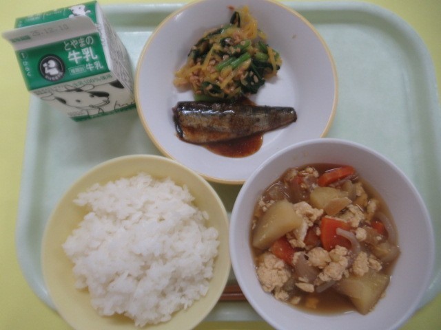 ・ごはん ・牛乳 ・いわしの土佐煮 ・納豆和え ・卵とじ