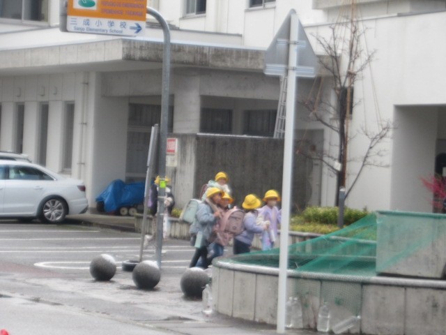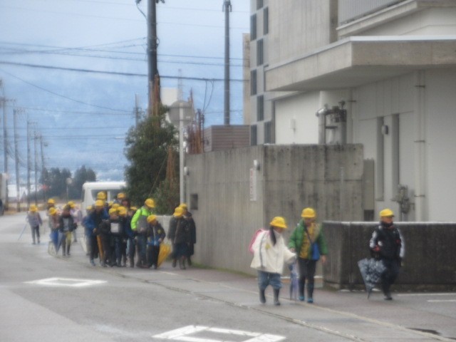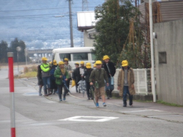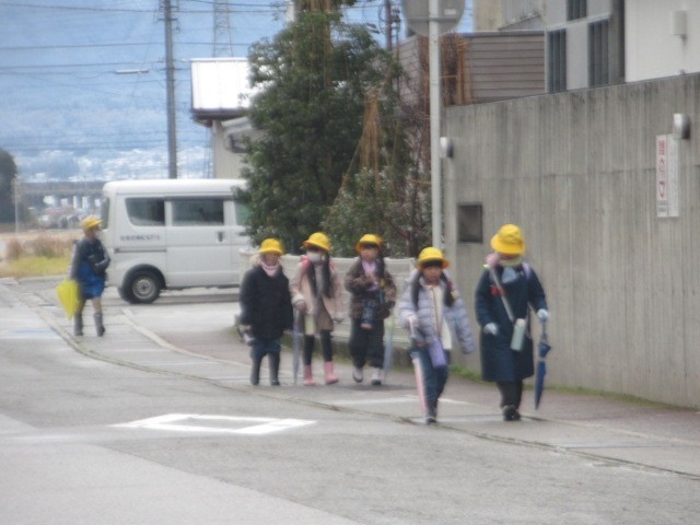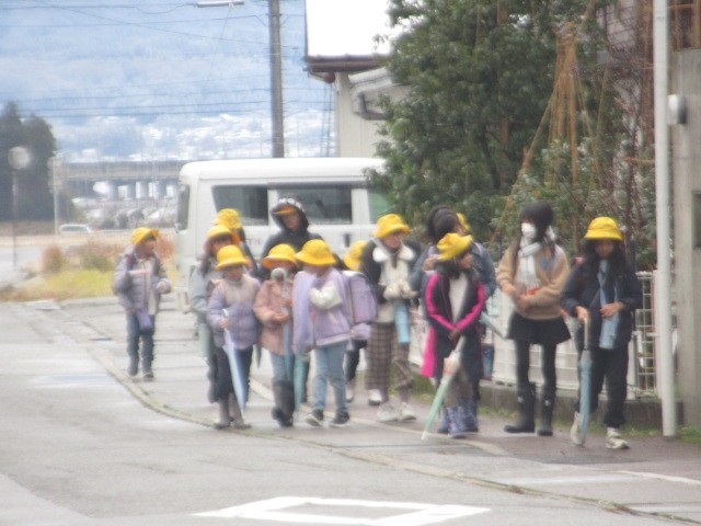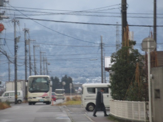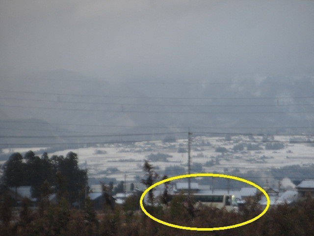 白く染まった滑川の丘陵をバックに、バスは無事に到着しました。がんばって登校しています・・・