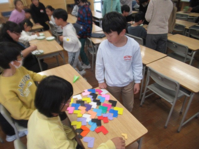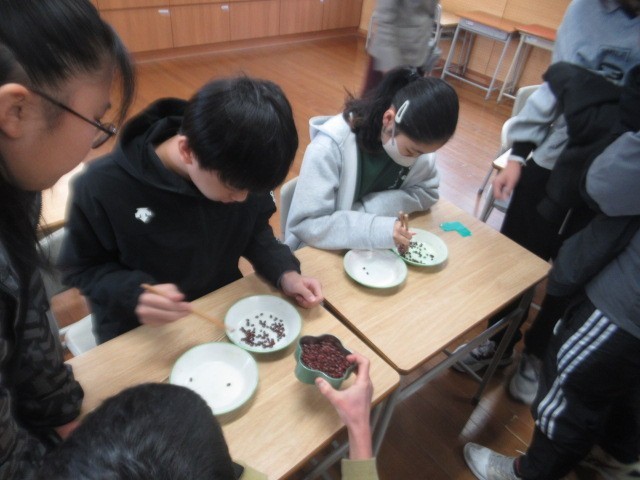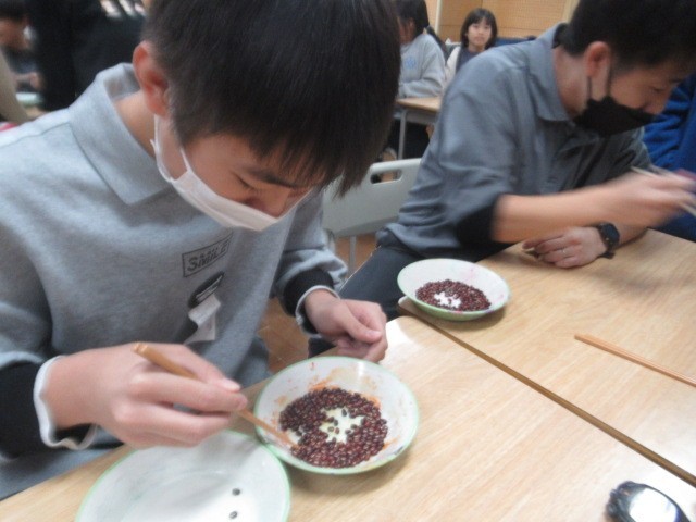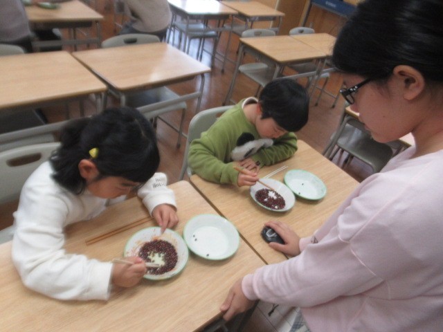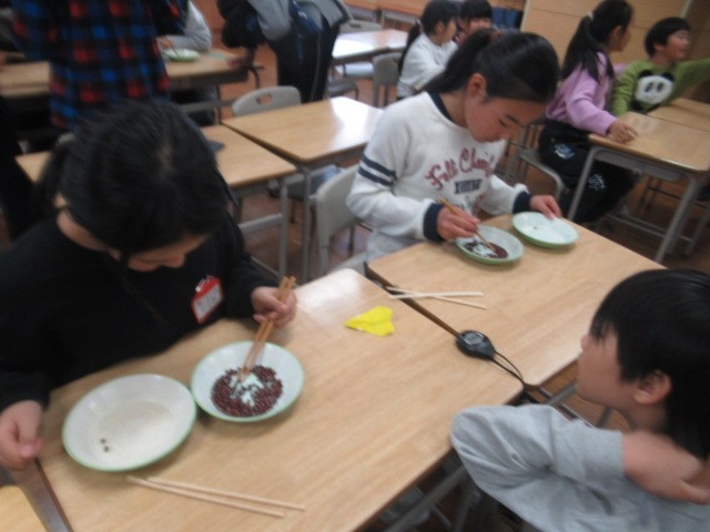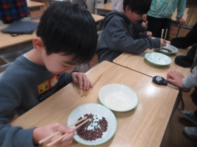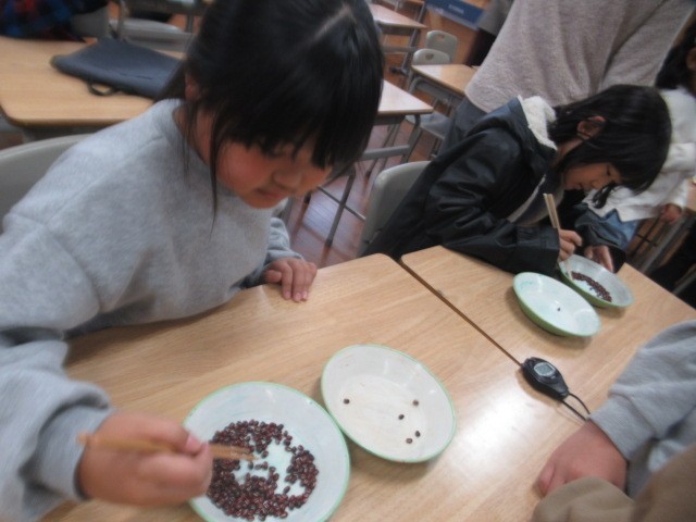 リベンジ大会が行われ、たくさんの子が集まり盛り上がりました。30秒間に、5個以上、10個以上、なんと15個以上も豆(小豆)を移動させた子も・・・