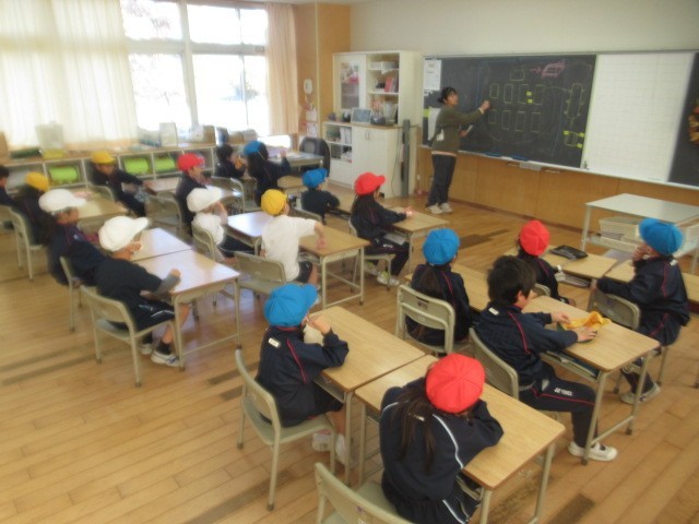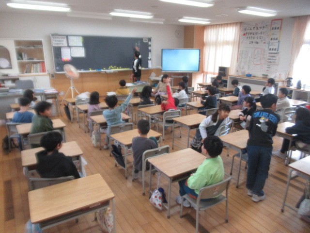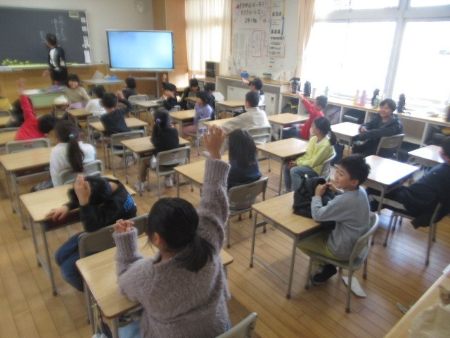 1年生は体育の準備をしています。2年生は「三成っ子フェス(12/22)」でする出し物のタイトル? を決めています・・・