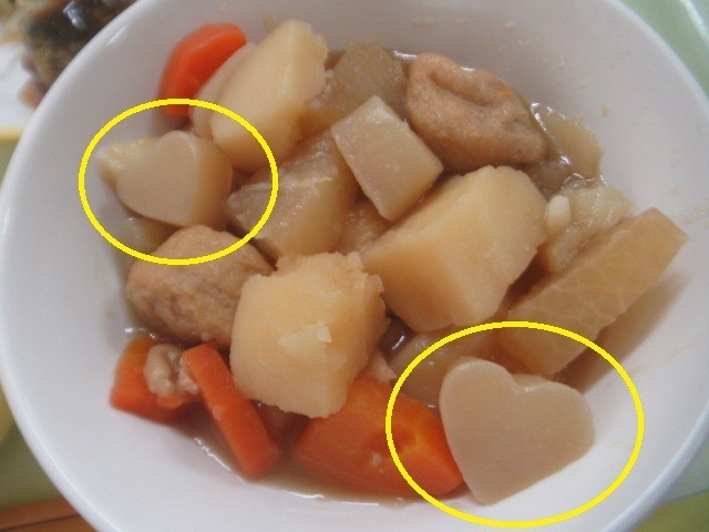 また、「おでん」には、運が良ければ?「ハート型」のこんにゃく(画像)が入っているかもしれません。お子さんに「入っていた?」と聞いてみてください。