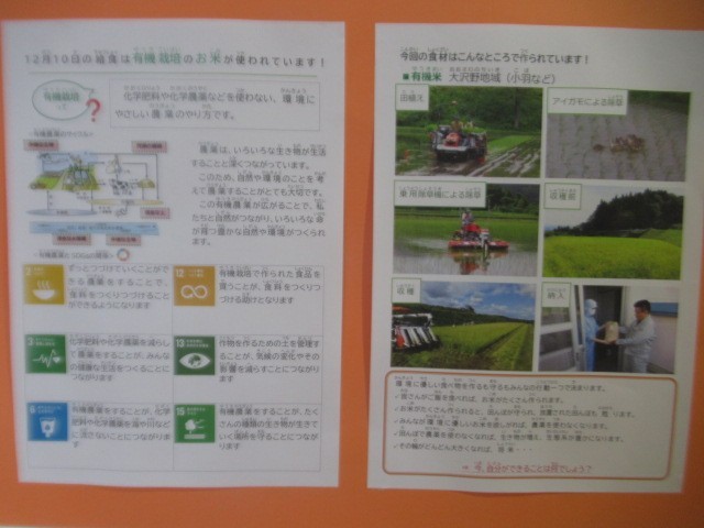 今日の「ごはん」には、アイガモ農法など「有機栽培」(化学肥料や化学農薬などを使わない、環境にも健康にもよい栽培方法)で作られた「有機米」が使われています。