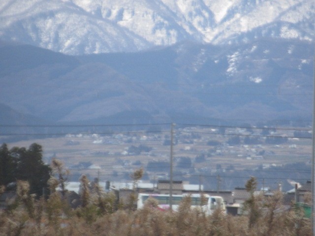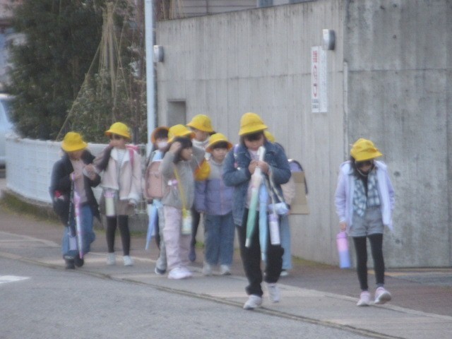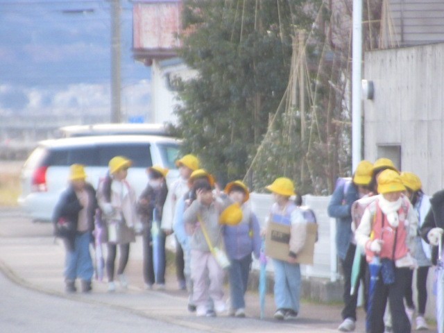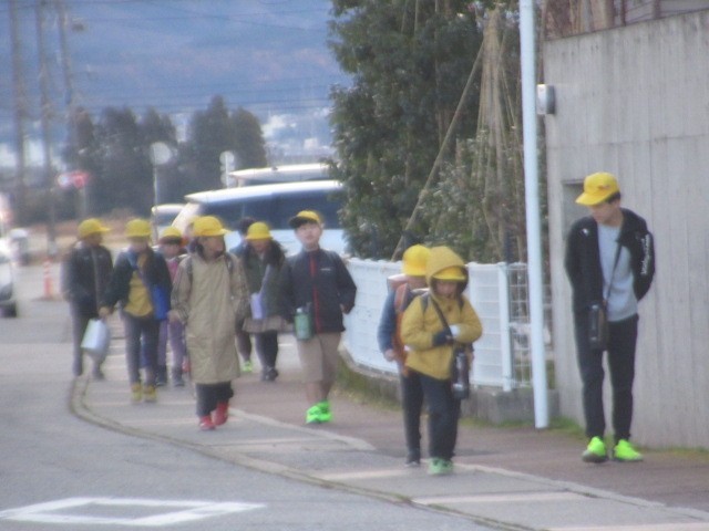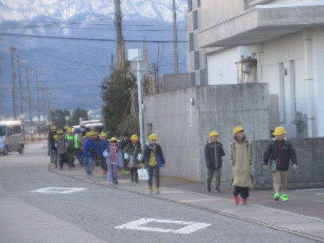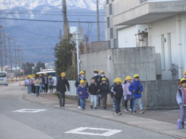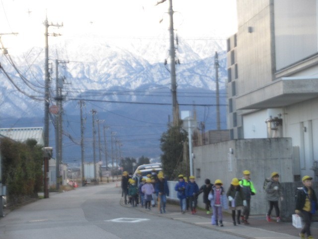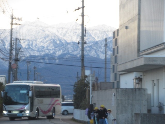 より白さが増した雪山を背にして、定刻に到着しました。元気に登校しています・・・