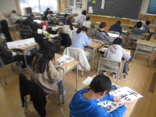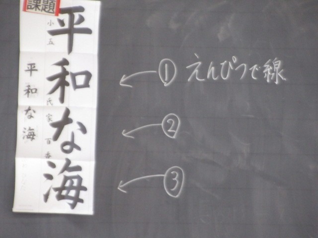 「『平』の縦棒が、折り目から、はみ出している」「『海』の上も、折り目から、出ている」など、早くも大切なポイントに気付いたようです。そうですね、「漢字」は「平仮名」よりも、少し大きく書きます。