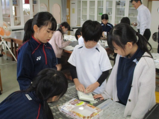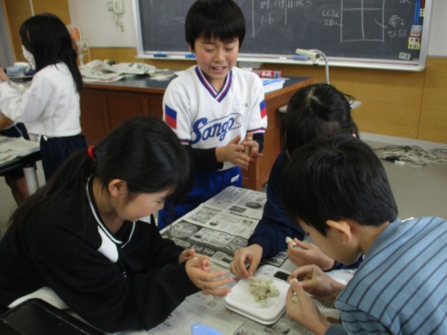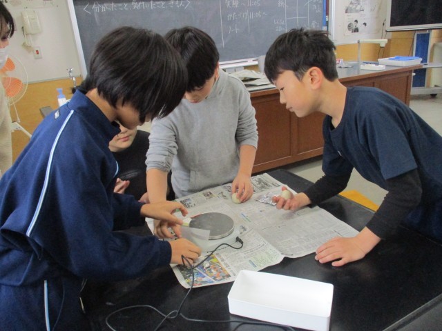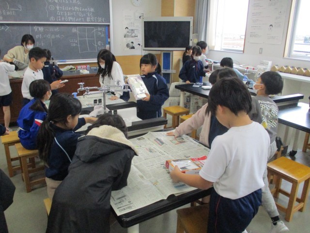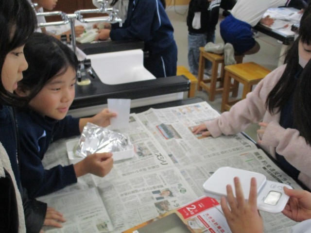 3年生は、理科「物の重さ」の学習で、初めて理科室で実験をしました。ちぎったり、丸めたりして形を変えた粘土の重さを比べる実験をしました。グループの友達と協力して活動しました。初めての理科室での授業だったので、子供たちはとてもワクワクした様子でした。