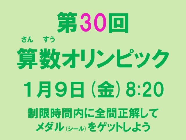 〔お知らせ〕 公開日 2026/01/08 更新日 2026/01/08 お知らせ 今学期も、もちろん継続します! 〔1年〕ひき算①② 〔2年以上〕ひき算② 「1問でも多く正解」「1秒でも速く」を目指して、がんばりましょう!