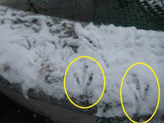 池の縁には、カラスの足跡がくっきり・・・やはりコイをねらっているのでしょうか?