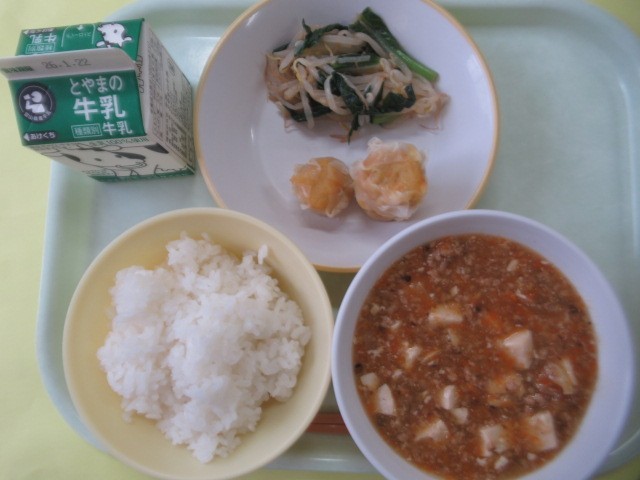 15日(木)今日の献立 公開日 2026/01/15 更新日 2026/01/15 給食室 ・ごはん ・牛乳 ・にんじんシューマイ ・塩ナムル ・マーボー豆腐※11時50分、検食終了。今日は、「中華風献立」です。 「にんじんシューマイ」は、1・2年生「1個(18g)」ずつ、3年生以上(9年生まで)「2個」ずつです。ただし、7年生以上は「1個 30g」と大きくなります。