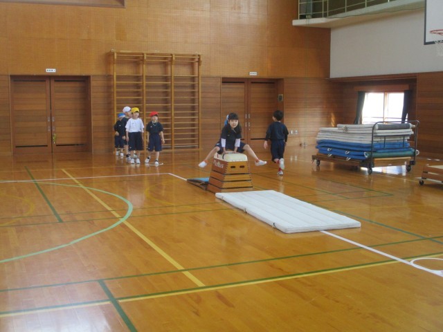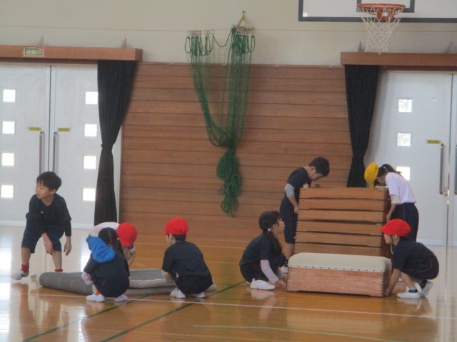 跳び箱を使っていろいろな跳び越え方をして楽しんでいます。最後まで協力して、片付けをしっかりと行っています。