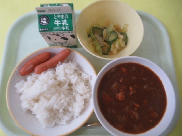 20日(火)今日の献立 公開日 2026/01/20 更新日 2026/01/20 給食室 ・ごはん ・ハヤシライス ・牛乳 ・あらびきウインナー ・グリーンサラダ※11時55分、検食終了。今日は、子供たちの大好きなメニューの一つ「ハヤシライス」です。 「あらびきウインナー」は、1・2年生「1本」、3年生以上「2本」、7年生以上「3本」です。(1本、14g)