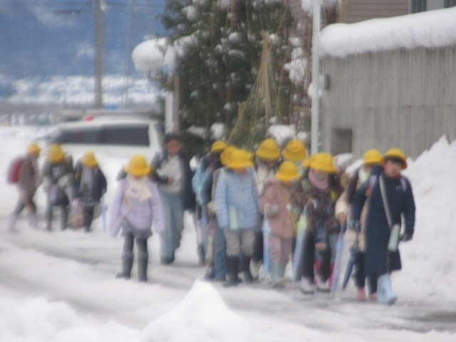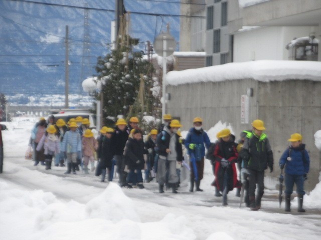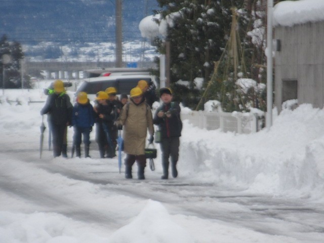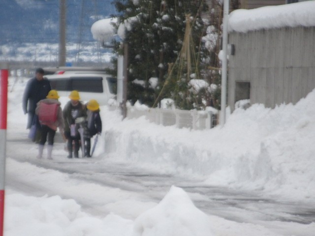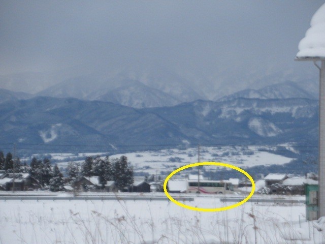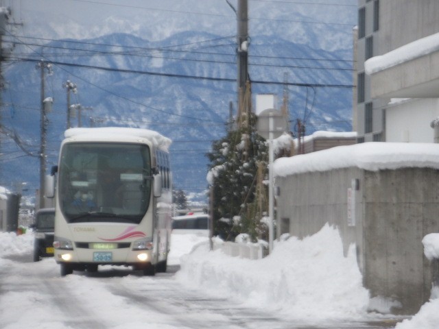 数分遅れですが、無事に到着しました。積雪や除雪した雪の塊があるため、道路幅が狭くなり、バスや車のすれ違いができない場所があります・・・