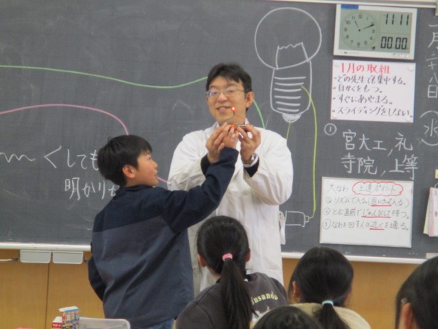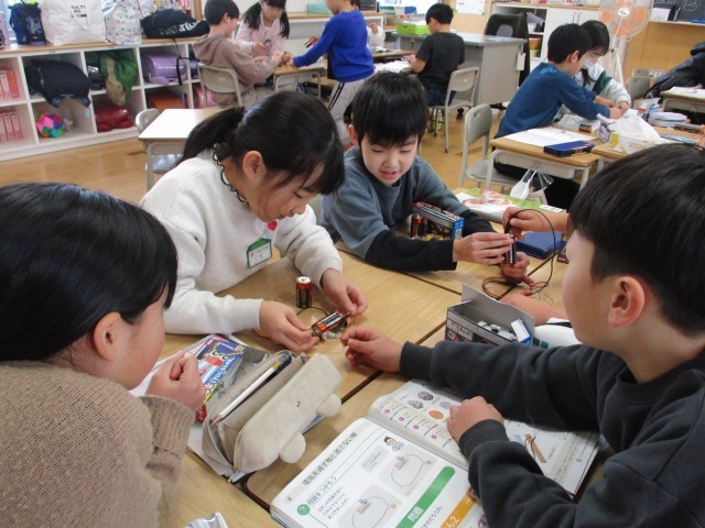 3年生は、「電気の通り道」の学習をしています。乾電池に導線をつないで、豆電球を光らせる実験をしています。今日は、友達と協力して、導線を長くつないで豆電球がつくか確かめました。最後に、LED電球にもつないで明かりがつくか確かめました。今日は、たくさん実験をして大満足の子供たちでした。