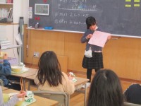 3年生は、外国語で、「What  is this?」の学習で3ヒントクイズに挑戦しました。「ヒント プリーズ!」と伝えて、友達から英語でヒントをもらい、相手の動物や果物などを当てるゲームです。子供たちは、色や形のヒント、それでも分からなければジェスチャーでヒントをもらい、楽しんでいました。