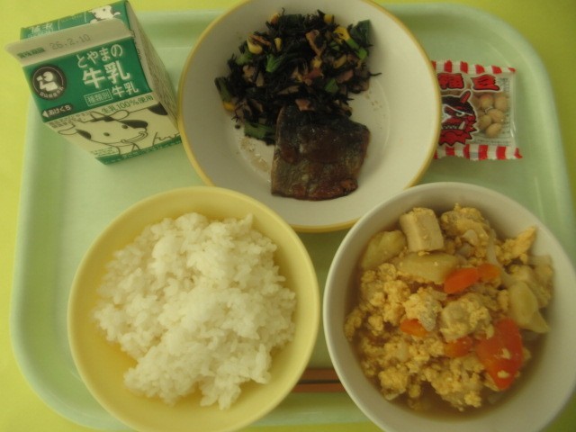 ・ごはん ・牛乳 ・にしんのみぞれ煮 ・ひじきとコーンのソテー ・卵とじ ・節分豆
