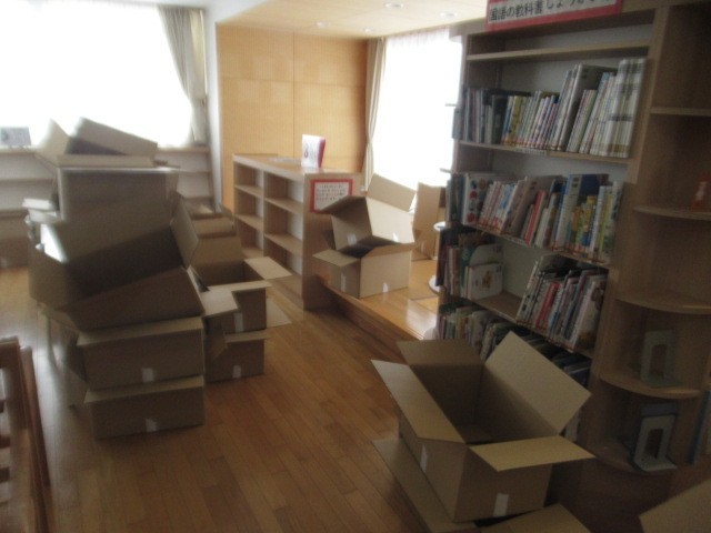 物品の移設が、2月中旬から始まります。それに向けて、急ピッチで箱詰め作業をしています。図書室では・・・