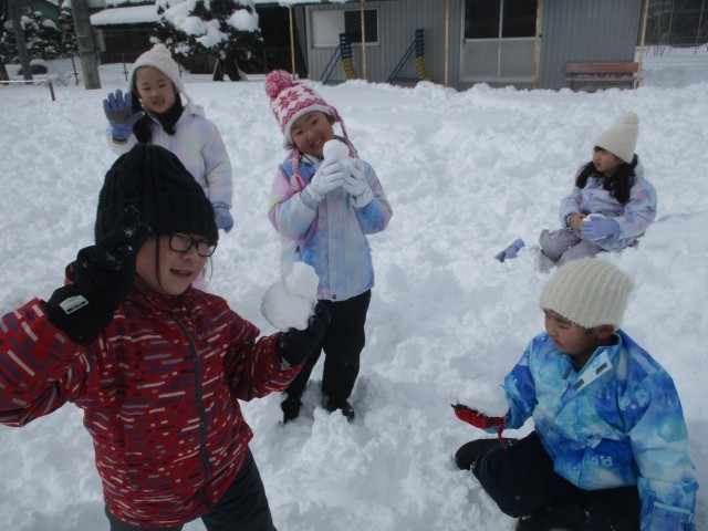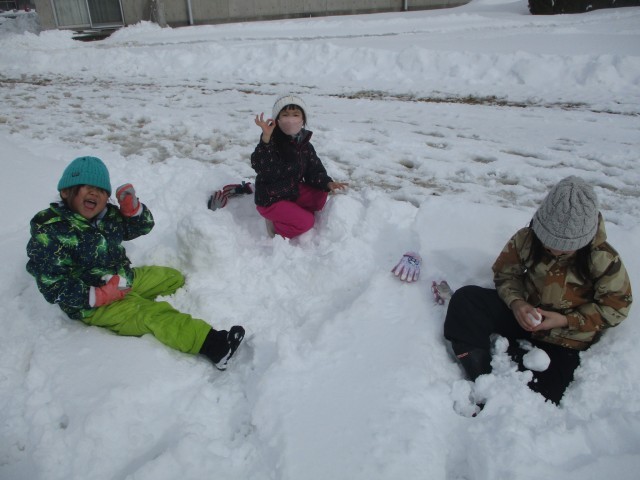 雪だるまを作りました。大きい雪だるま、小さい雪だるま、砂や泥で顔のある雪だるま…いろいろな種類の雪だるまが完成しました。