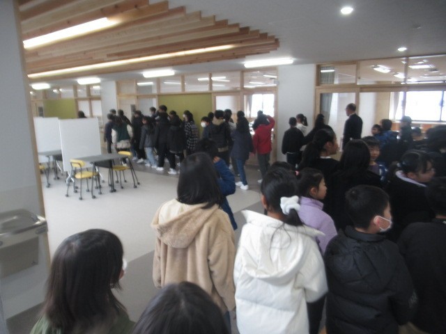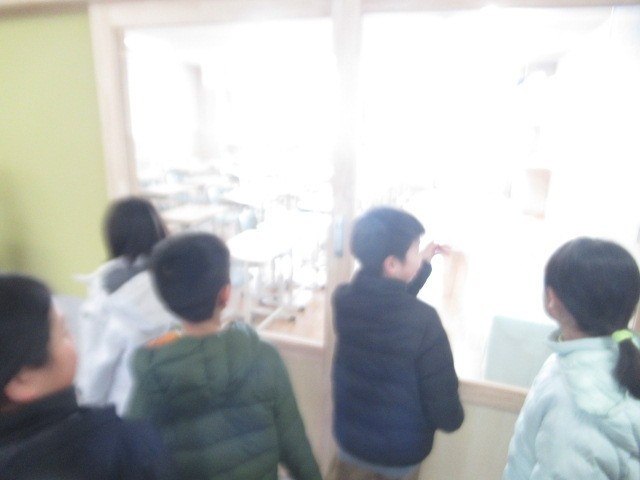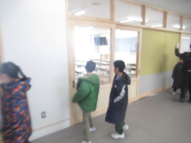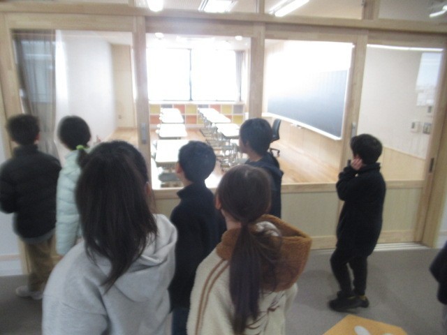 「教室のテレビがおっきーいぃっ!」「黒板がまがってるぅ!(教室の両側の子も見やすいように湾曲しています)」と、つぶやきが聞こえてきました。