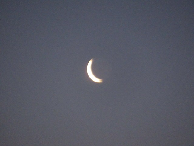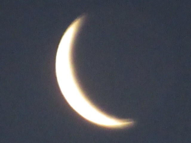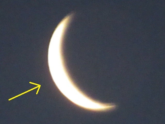 14日(土)午前6時頃、東の空、見事な「三日月」が見えました。「→」の方向(東)から太陽が昇ってくることが分かります・・・