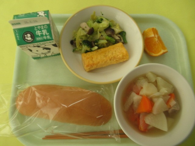 ・コッペパン ・牛乳 ・卵ロール ・ブロッコリーときのこのアヒージョ ・ポトフ ・いよかん