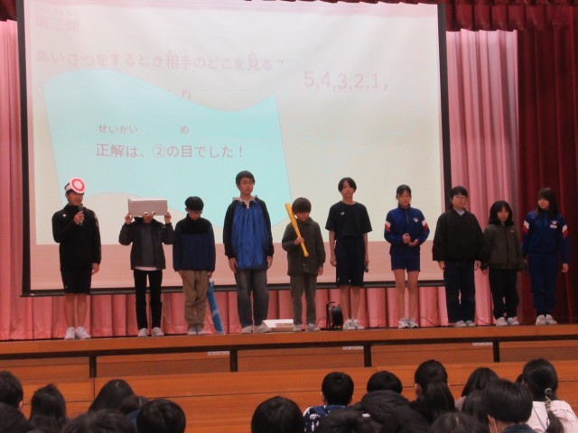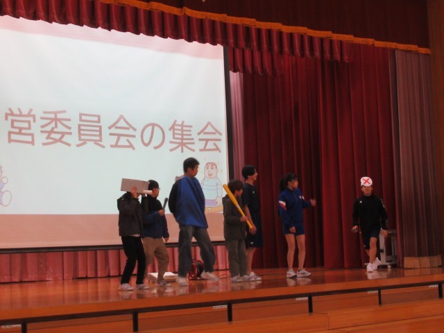 三成っ子タイムには、全校集会が開かれ、生活委員会と運営委員会の発表がありました。