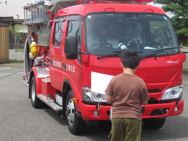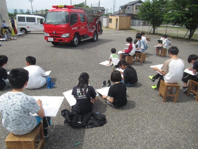 新器具置場のシャッター(左)には、6月13日(金)写生会で描いた「消防ポンプ自動車」(2枚目以降)が、地域の安全を見守っています・・・