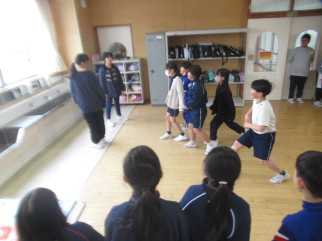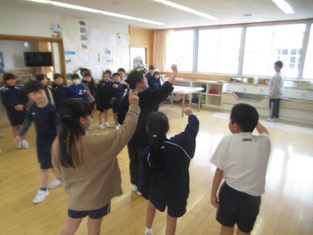 6年生と3年生は「だるまさんが転んだ」 すばやい接近、面白い動きに、笑顔がはじけます・・・