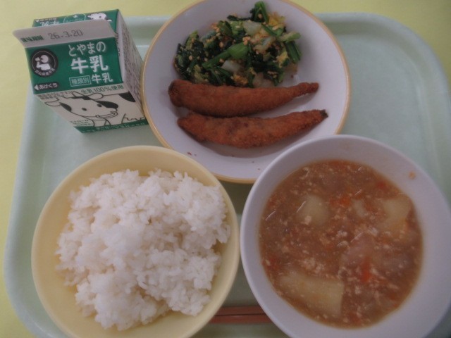 13日(金)今日の献立 公開日 2026/03/13 更新日 2026/03/13 給食室 ・ごはん ・牛乳 ・ししゃもフライ ・いり大豆和え ・じゃがいものそぼろ煮※11時45分、検食終了。 今日も美味しく調理されています。6年生は、今日を含めないで、あと「1食」(3/16)となりました。1~5年生は「+3食」です。