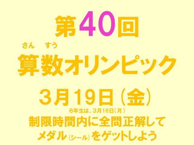 〔お知らせ〕 公開日 2026/03/18 更新日 2026/03/18 お知らせ いつの間にか? 「第40回」となりました・・・ 〔1年〕ひき算①、ひき算② 〔2年〕かけ算九九 〔3年以上〕わり算九九(2年生もチャレンジ?)