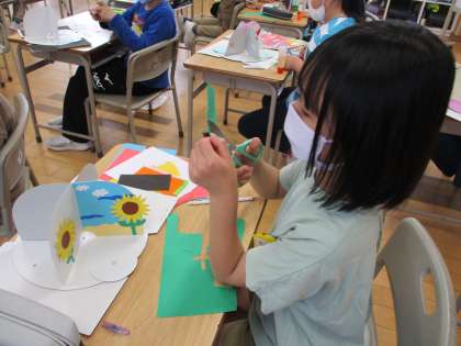 図画工作科の学習(3年生) 公開日 2022/04/26 更新日 2022/04/26 3年生 図画工作科の学習では、くるくるランドをつくっています。「どんなテーマで作品をつくろうか」「回る土台に何をのせようか」など、イメージを膨らませながら活動しています。