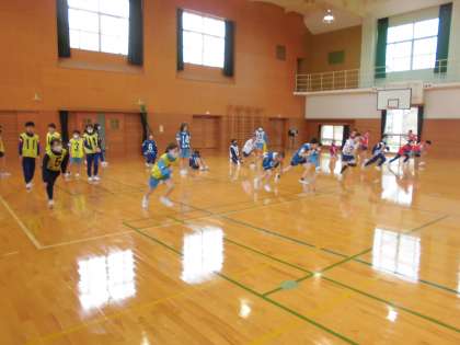 体育館で「体つくりの運動」を行いました。いろいろな体勢からダッシュをしたり、折り返しリレーをしたりして、体を動かしていました。