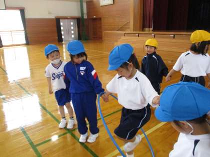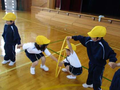 体育の学習でフラフープくぐりをしました。団の仲間と協力して素早くくぐろうとしている子供たちの様子です。