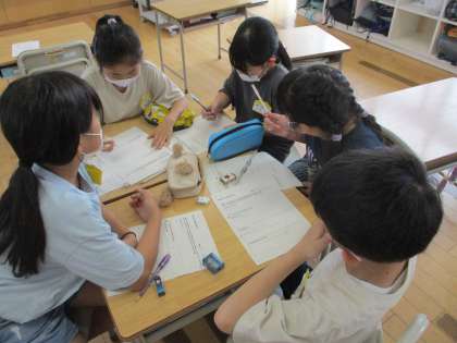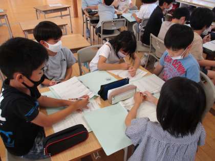 総合的な学習の時間には三成地区のステキを見付けています。自分たちが調べてみたい場所について、「どんなことを知りたいのか」「調べる方法は何があるか」などをグループの友達と相談して考えています。
