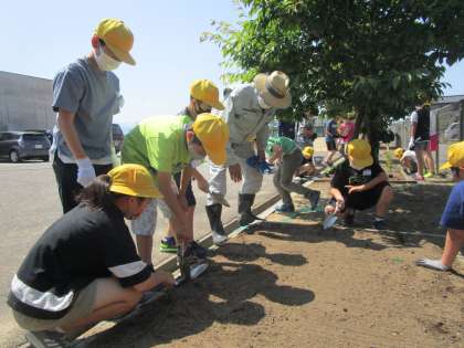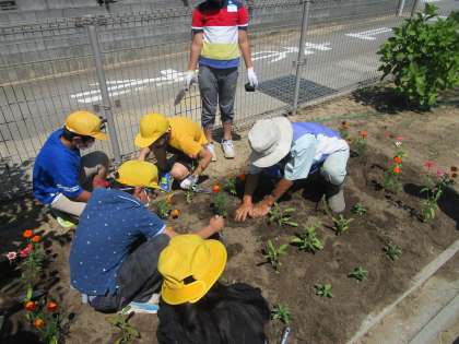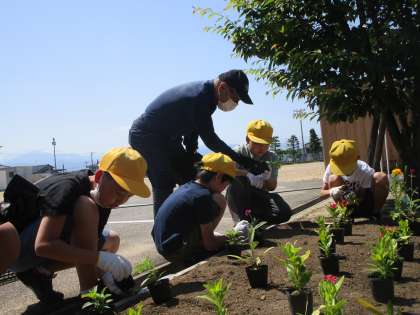 地域の方との苗植え 公開日 2022/06/02 更新日 2022/06/02 5年生 地域の方と協力して玄関先の花壇に苗を植えました。 ポットから取り出した苗の根を少しほぐしてから植えることや、植えて10日ほど経ったら茎を切ることなど、花が大きく育つポイントを教えていただきながら楽しく活動しました。