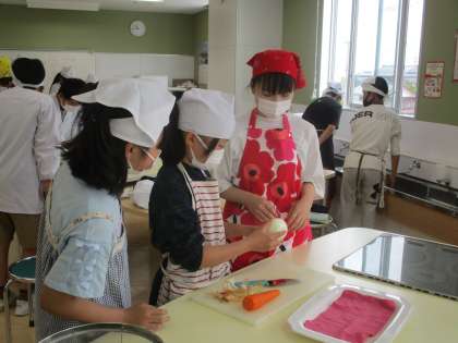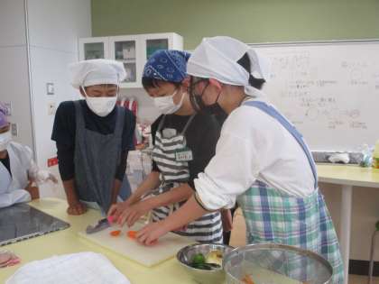 家庭科では、野菜炒めを作りました。炒める人や切る人等、役割分担を決めて調理しました。分からないところや困ったところがあったときには、協力して活動していました。