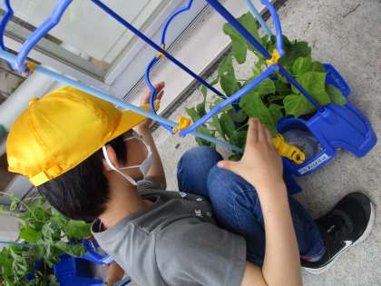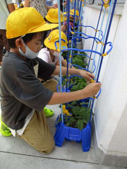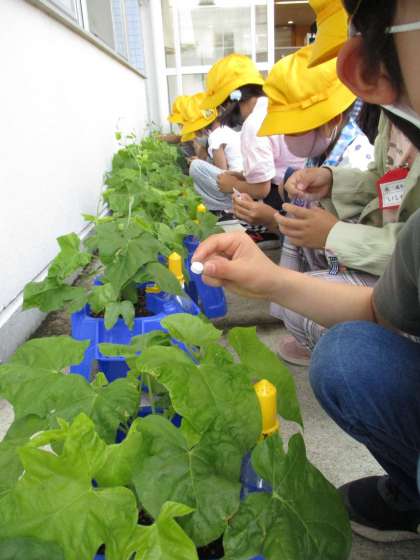 5月に植えた朝顔も、だんだん大きくなってきました。もっと大きくなるように、肥料を追加したり、支柱を立てたりしました。また、窮屈でかわいそう、家でも育てたい、と朝顔を持ち帰る子供もいました。